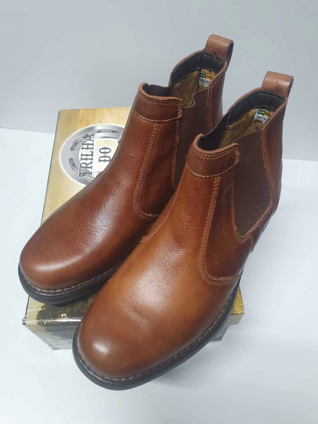 Botina Masculina Country, marca Trilha do Gado, fabricada pela Botinas F1000, produzida em couro legítimo, possui cano curto com elásticos laterais, costuras reforçadas e solado anatômico, de borracha.