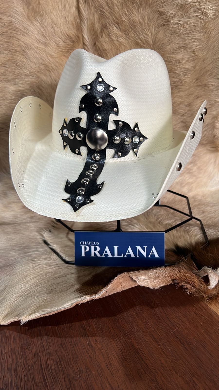 Fabricado em palha Shantung na cor Natural, aba de 8,5 cm, copa de 9 cm, com detalhes em rebites de metal, cruz preta em recouro na copa com strass e rebites e carneira de elástico.